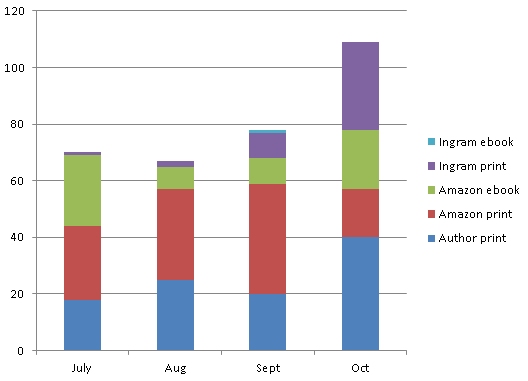 Initially nearly all sales were through Amazon. More recently, sales have been increasing from brick-and-mortar book stores through the Ingram wholesale channel.  Plus, sales are starting to come from Europe, most recently from France, England, and Germany. The chart of sales since the July 4, 2015 publishing date shows the upward trend and the breakdown of sales channels.